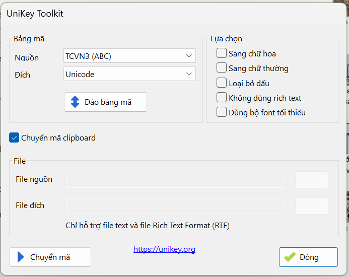– Bảng mã Unicode: Đổi đúng bảng mã là khi bạn đổi font trên file .docx thành Arial mà đọc rõ tiếng Việt không lỗi dấu. Còn lại, dùng Unikey Toolkit để đổi bảng mã. Với các loại tài liệu cũ sử dụng bảng mã cổ như TCVN3, VNI… (COPY toàn bộ sách -> vào Unikey toolkit ấn CHUYỂN MÃ -> PASTE lại vào văn bản với bảng mã mới).